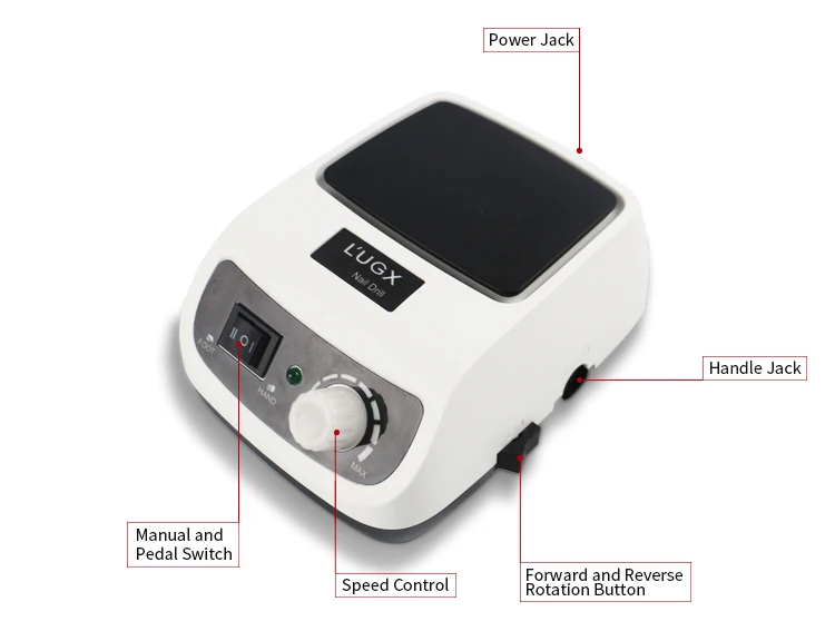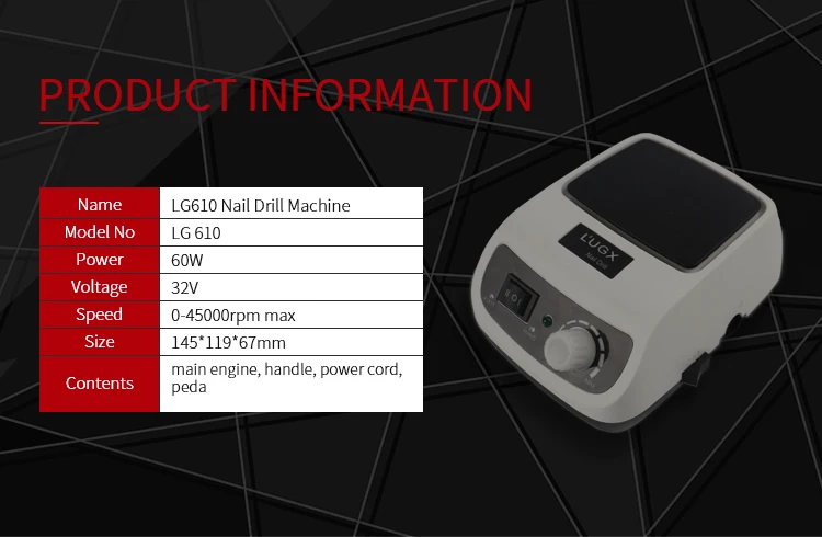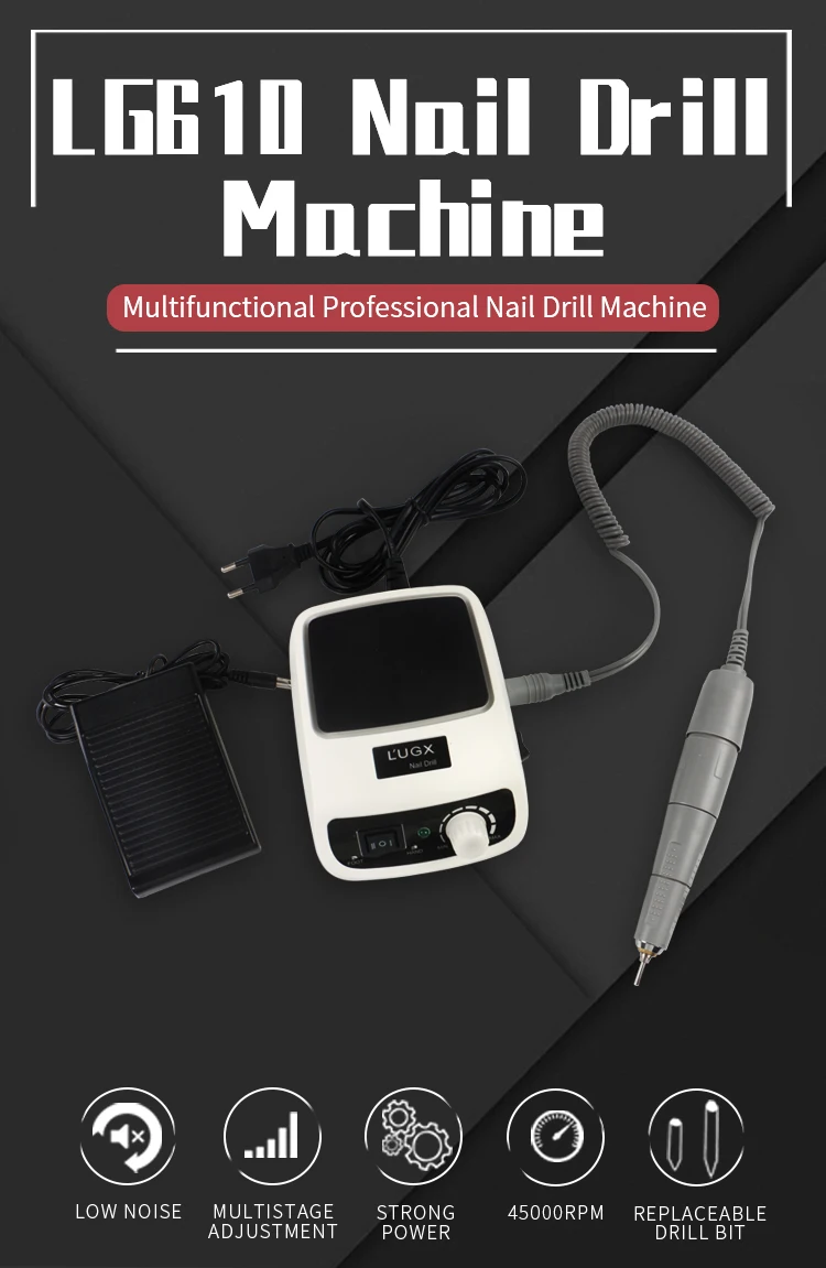 LG610 is a professional intelligent high-speed nail drill machine. The motor is powerful, and the speed is up to 45000RPM. It needs just about 5 minutes to remove gel polish and will not hurt hands. Forward and reverse rotation of the drill bit can be switched. The movement inside the handle is imported from Korea. It is low-noise and high-speed with the power of 60W. There is a cushion on the machine, to make users a comfortable experience.