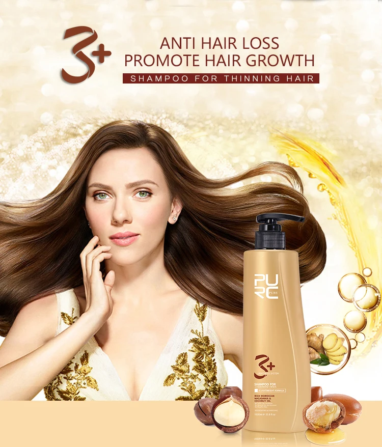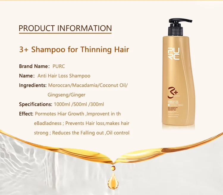 product information, 3+ shampoo for thinning hair, anti hair loss shampoo, ingredients: moroccan / macadamia / coconut oil / gingseng / ginger, specifications: 1000ml / 500ml / 300ml, effect: pormotes hair growth, improvement in the badladness, prevents hair loss, makes hair strong, reduces the falling out, oil control