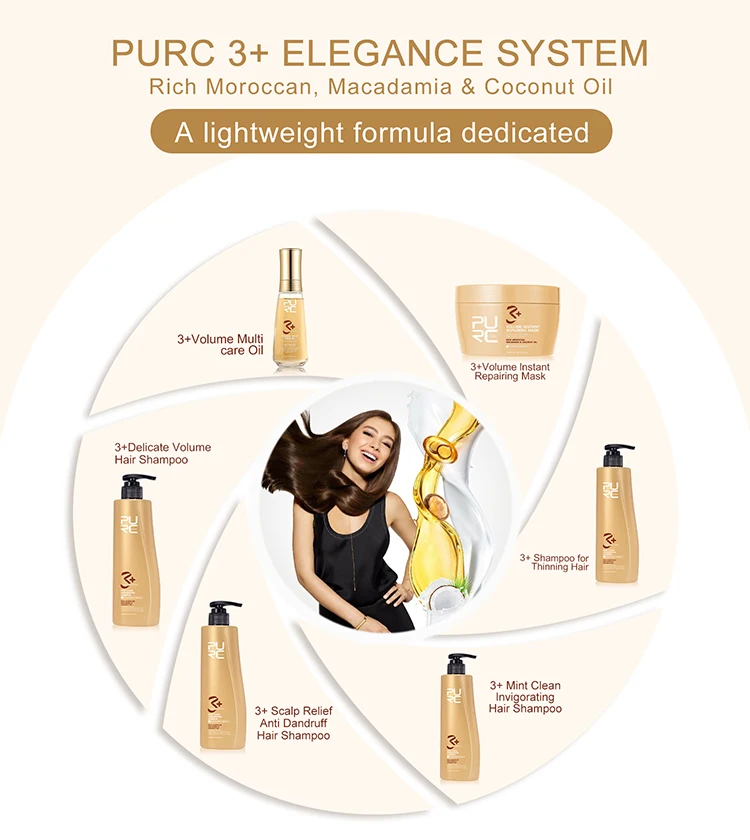 PIRC 3+ elegance system, rich moroccan, ,macadamia & coconut oil, 3+ volume multi care oil, 3+ volume instant repairing mask, shampoo for thinning hair, mint clean invigorating hair shampoo, scalp relief anti dandruff hair shampoo, delicate volume hair shampoo