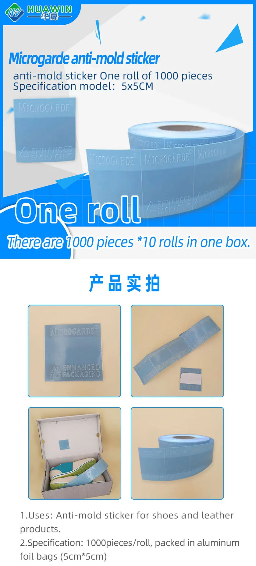 Huawin anti mold stickers are a safe and effective method for preventing moldand are designed for many box packed items particularly footwear.Huawin stickers are delivered in foil sealed pouches and are easy to use with one or more stickers placed in the individual box at time of final packing.