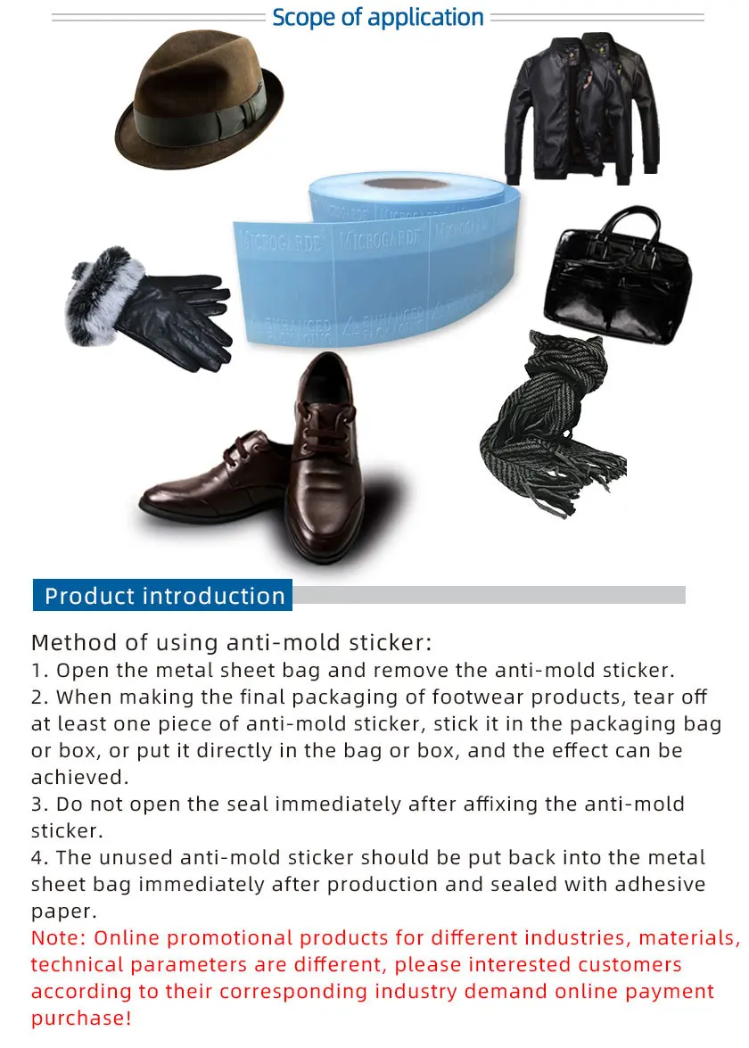 When using anti-mold sticker,merely put it inside the box or bag that used to package the goods,then sealed up in the carton,the anti-mold factors would release inside the sealed space to protect the goods.