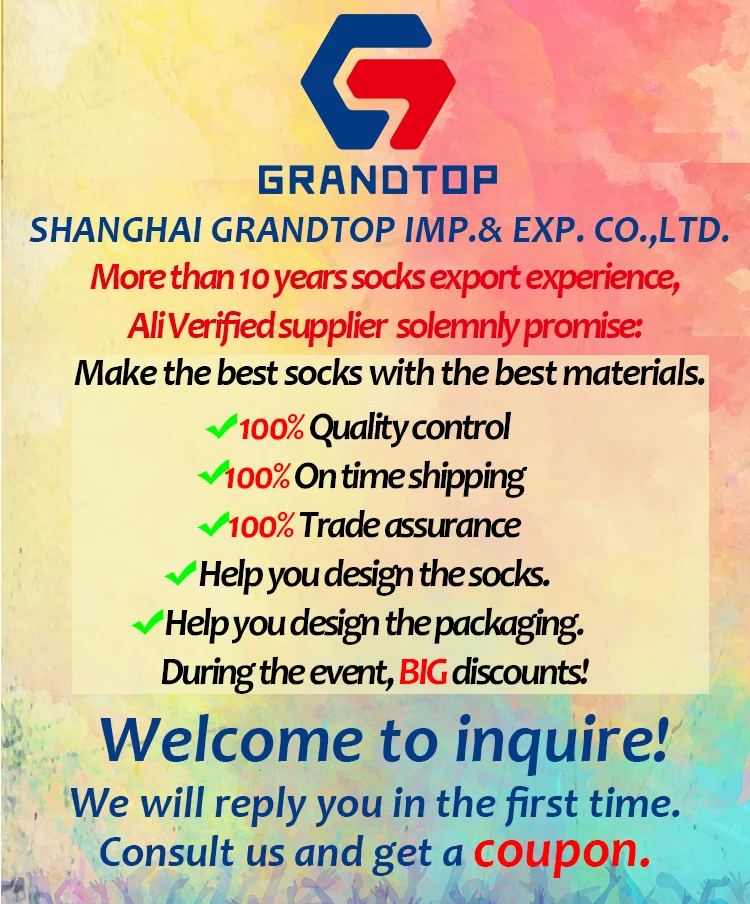 Shanghai Grandtop Import & Export Ltd. is a professional trading company,Our company predecessor established in 2007.Our main business is to help customer work well in purchasing products in China. From design, knitting, seaming, shaping, to inspection and packaging, we have a complete set of production process and quality assurance system. We work with China's leading sock manufacturers to have strict control over the quality of the socks,