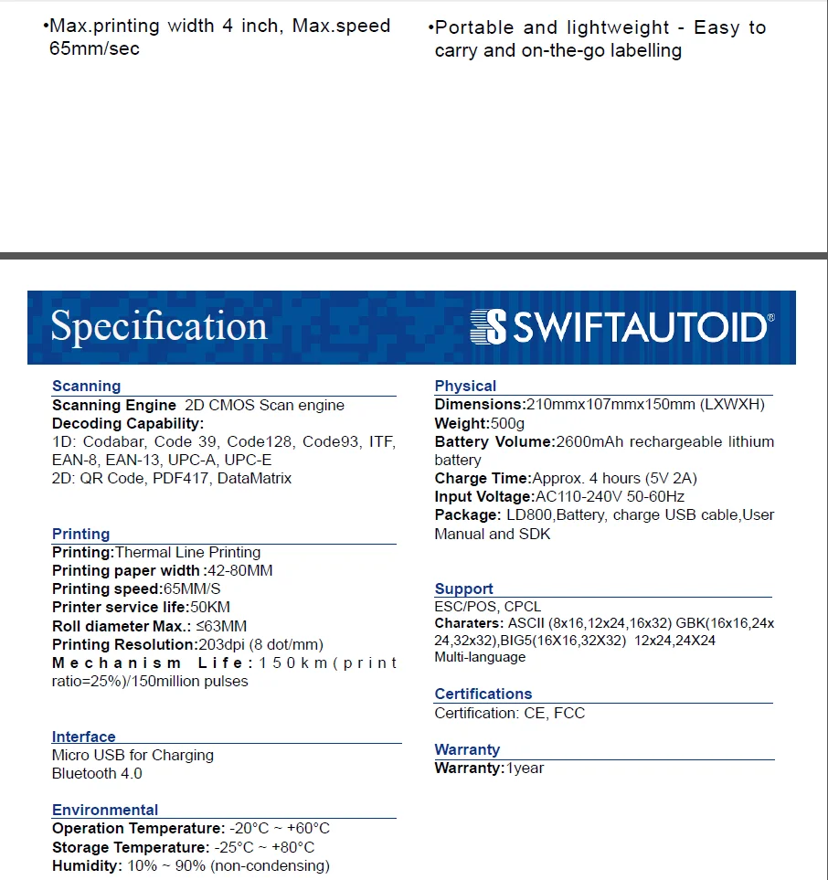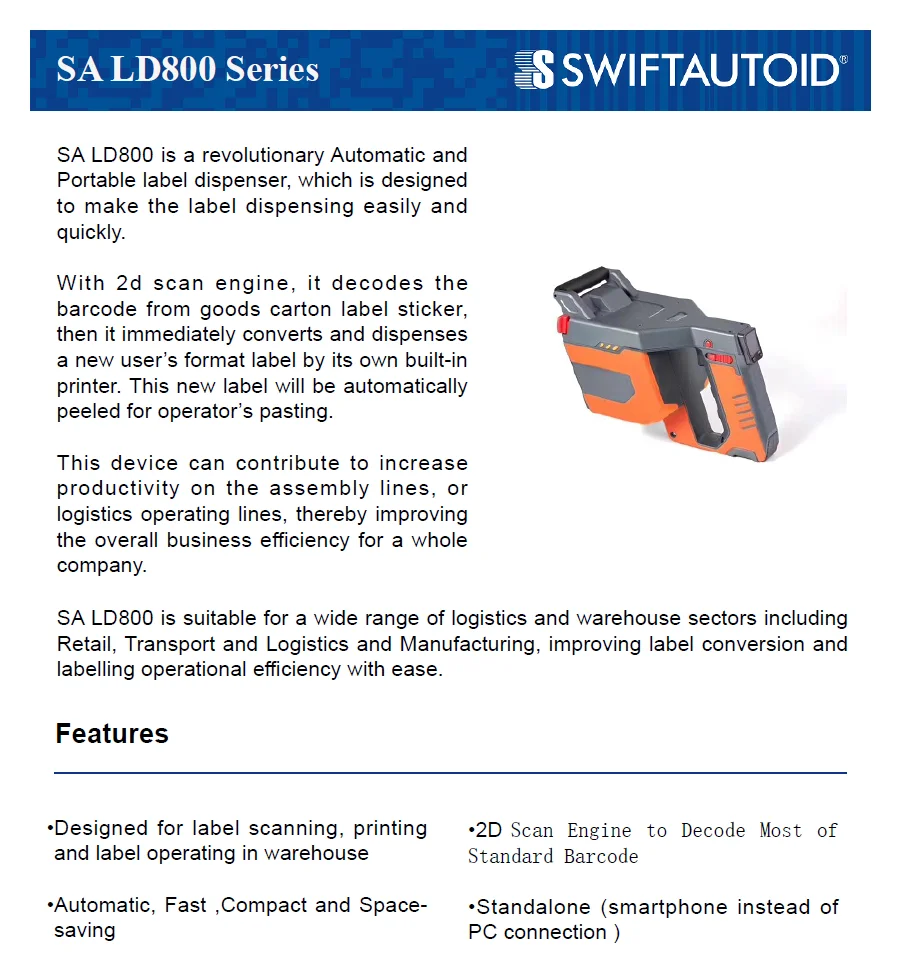 SA LD800 is a revolutionary Automatic and Portable label dispenser, which is designed to make the label dispensing easily and quickly. With 2d scan engine, it decodes the barcode from goods carton label sticker, then it immediately converts and dispenses a new user’s format label by its own built-in printer. This new label will be automatically peeled for operator’s pasting. This device can contribute to increase productivity on the assembly lines, or logistics operating lines, thereby improving the overall business efficiency for a whole company
