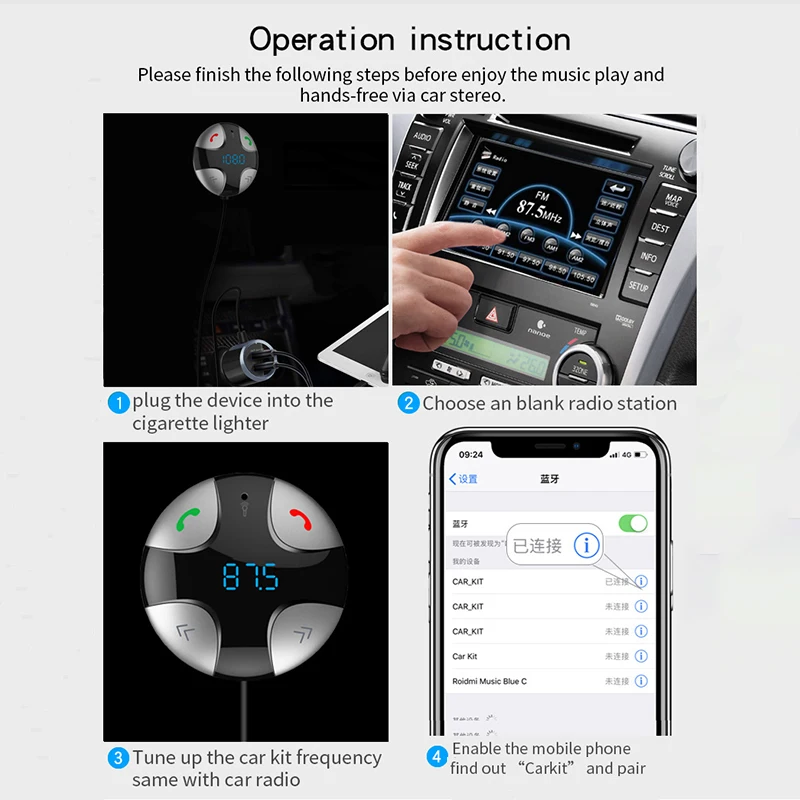 Package Included: *1 x Car Kit Handsfree FM Transmitter