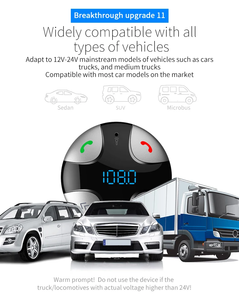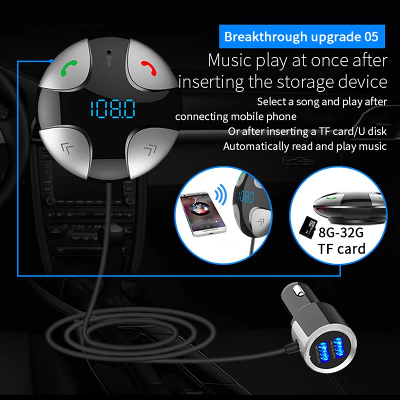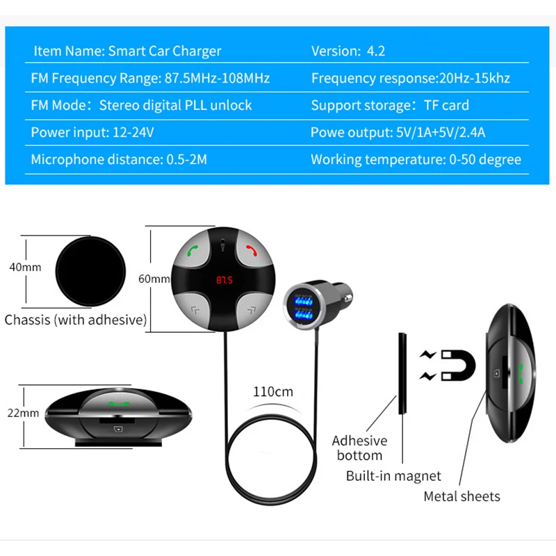 Feature: -It can adjust any angle and is suitable for all kinds of vehicles. -Support digital display. -BT Hand-free Call. -Support BT Stereo Music Playing. -Echo Cancellation and Noise Suppression (CVC) Technology in Telephone. -Supporting USB to power other devices, maximum output 5V/3.4A. -Support Stereo Output and FM Emission Technology. -Memory function of automatic power off. -BT V4.2. -Support BT Background Running. -Support TF music playback. -Support MP3 music format