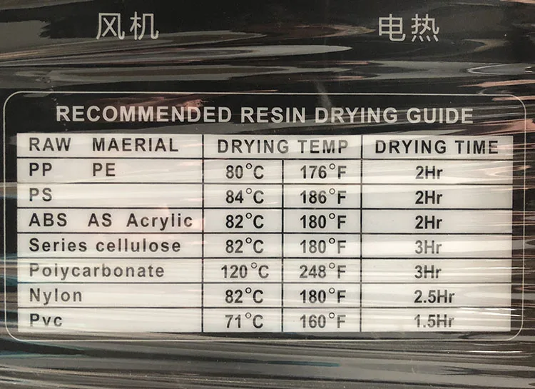 Capacity 25Kgs or 50Kgs, Heater Power 380VAC 3.2KW or 4.2KW, Blower Power 220VAC 120 or 180W, applicable Injection Molding Machines 30-60g or 125-500g