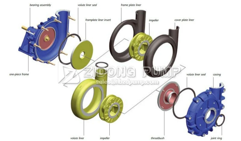 ♣The frame plates for type ZH centrifugal slurry pumps have replaceable wear-resistant metal liners or rubber liners.