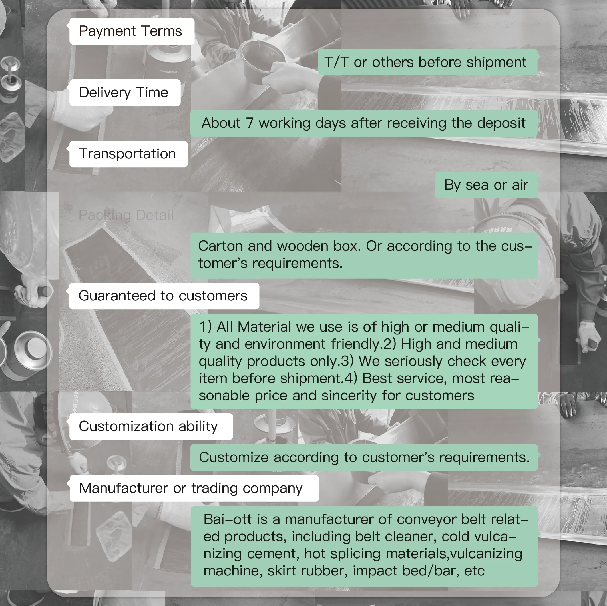 Repair strips for repair, finishing or reinforcement(longings), they provide maximum protection in splices and repairs of conveyor belt against infiltration, and quickly repairing tears.
