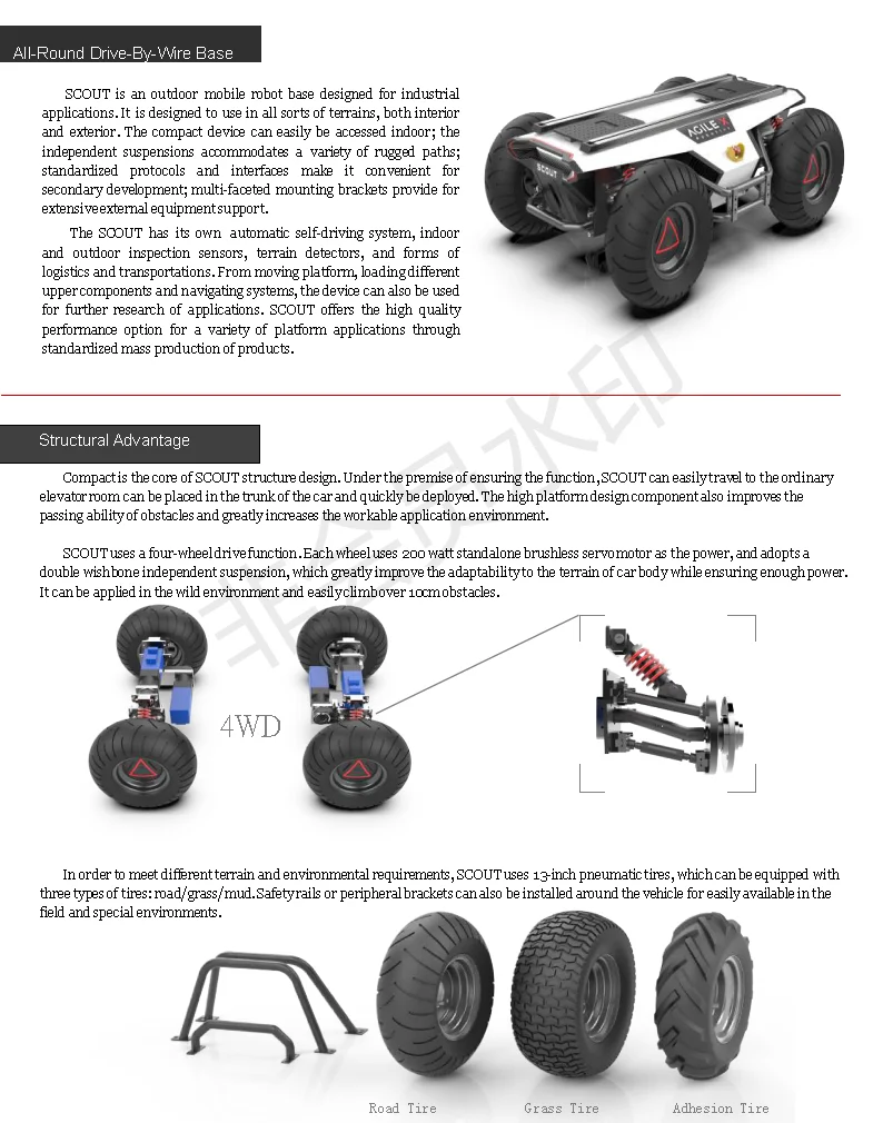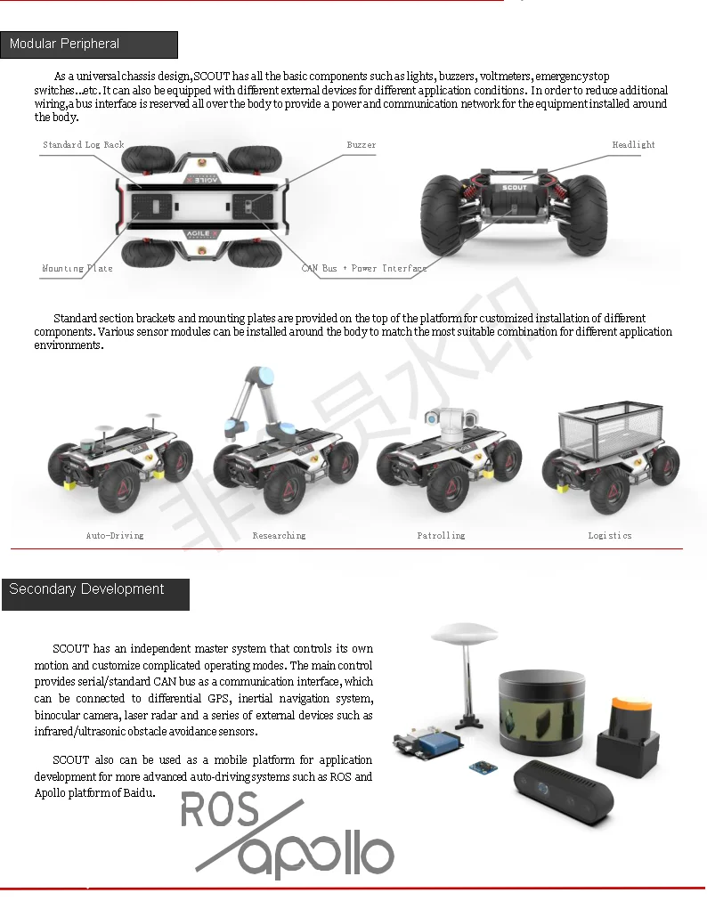 The SCOUT has its own automatic self-driving system, indoor and outdoor inspection sensors, terrain detectors, and forms of logistics and transportations. From moving platform, loading different upper components and navigating systems, the device can also be used for further research of applications. SCOUT offers the high quality performance option for a variety of platform applications through standardized mass production of products.