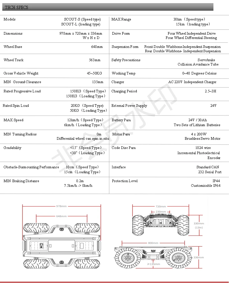 Models | SCOUT-S (Speed type) SCOUT-L (loading type) | MAX Range | 30km(Speed type) 15km(loading type) |