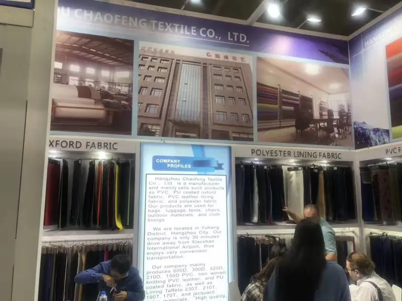 Hangzhou Chaofeng Textile Co., Ltd. is manufacturer. We are specialized in making polyester taffeta fabric, minimatt fabric, oxford fabric with 12 years. We have our own weaving, dyeing factory, and mainly sells such products as PVC/PU coated oxford fabric, PVC leather, lining fabric, and polyester fabric. Our products are used for bags, luggage, tents,chairs,outdoor materials, cloth linings and so on. We can offer 6 million meters each month. "High quality, reasonable price, quick delivery and excellent service" are the most important principles we are following.