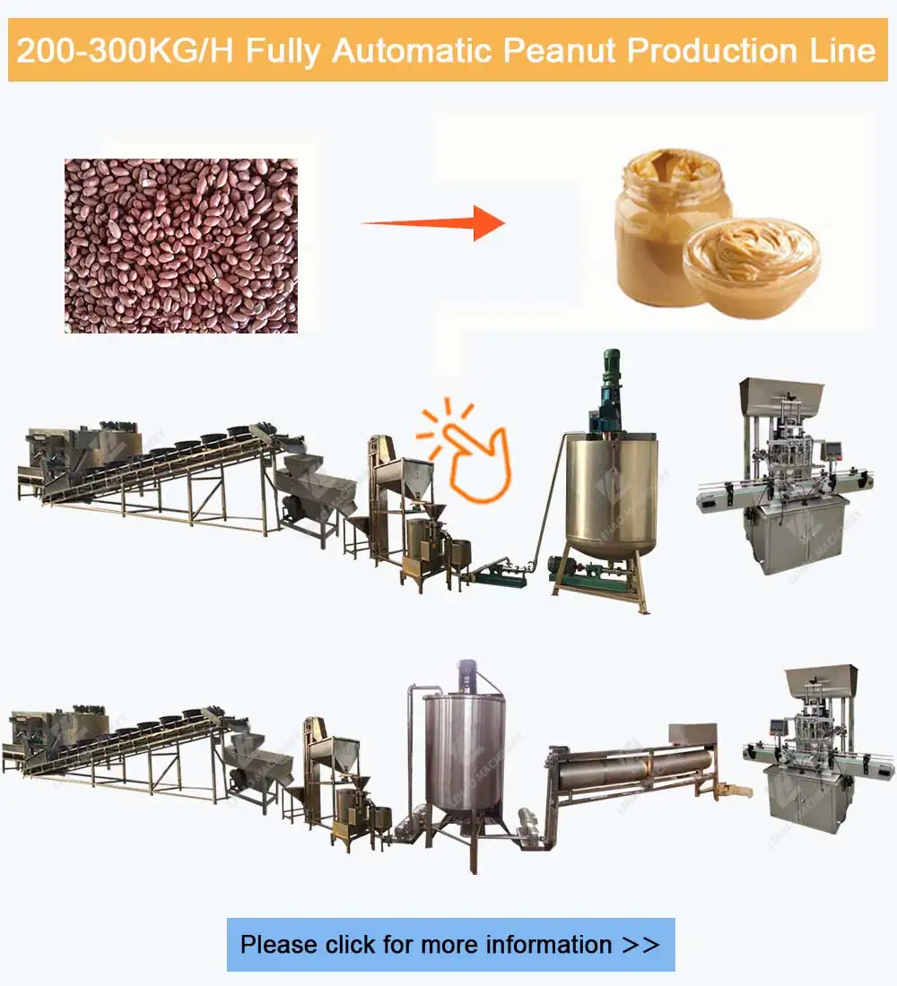 300-1000kg/h | Continuous Dryer, Continuous Cooler, Elevator,Peeling Machine, Elevator, Vibrating Feeder , Peanut Butter Grinding Machine, Buffer Tank, Pump, Vacumm And Mixing Tank, Pump , Peanut Butter Cooling Machine And Filling Machine | 40-100㎡ |