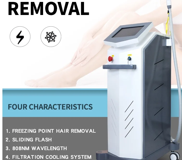 (1) freezing point hair removal (2) 808nm wavelength (3) Depilation process based on selective photothermal principle,Destroy germinal cells without destroying epidermis and surrounding cells (4) 808 freezing point depilation cooling technology enables the surrounding energy directly into the hair root, while cooling and protecting the surrounding tissue of the skin, improving user comfort..