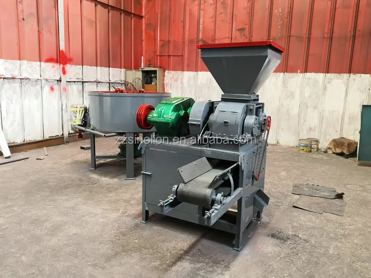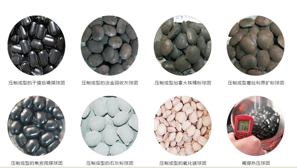 This series of petroleum coke briquettes machine will pass the power on to the two pressure roller through the reducer.The two sides and roll rotation, in both the rotating roll,Natural materials to enter the ball roll mode, with the roll rotation, material pressure on a small become larger, When the material to the two rollers rotating line contact point, the pressure of materials has reached the peak. Tremendous pressure in the role of line, the materials become a finished product from the powder ball.