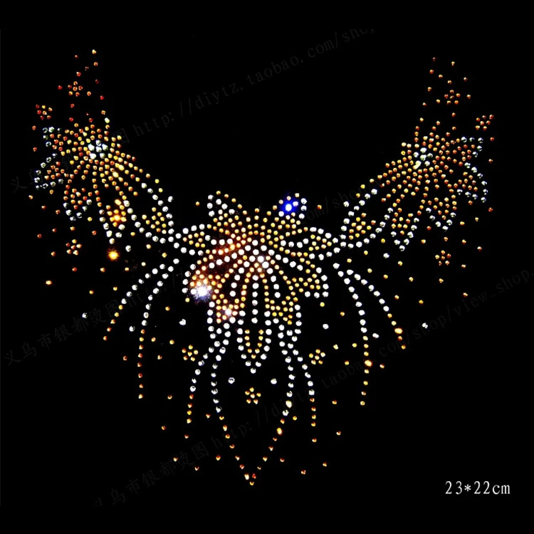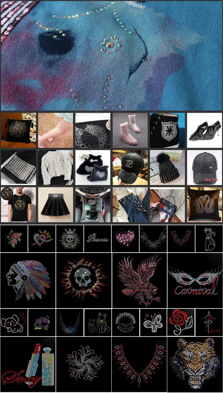 Hot Fix Rhinestone Transfer Motif Design is widely used in decoration of Clothing and Fashion Accessories. It can make your artwork more fashionable, more exquisite, more shiny, and more easily recognized by everyone. We can see avrious of patterns made up of them in clothes, shoes, bags, jewelry, even wedding scenes, etc.