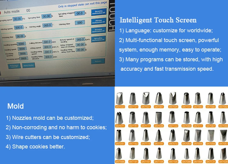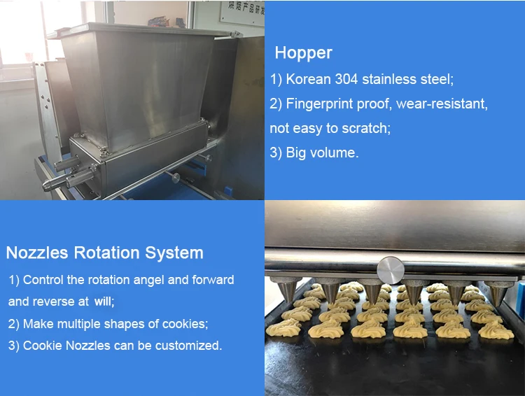 2.HY-1011Z is type 600 with 9 nozzles,suitable tray is 400*600mm. It uses coordinate method to make cookies. The biggest advantage of this machine is that it can imitate human's hand to make cookies of any shape, whether it is the shape of bear, fish or rose, whatever.