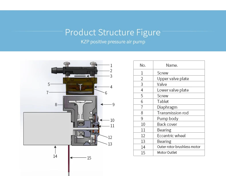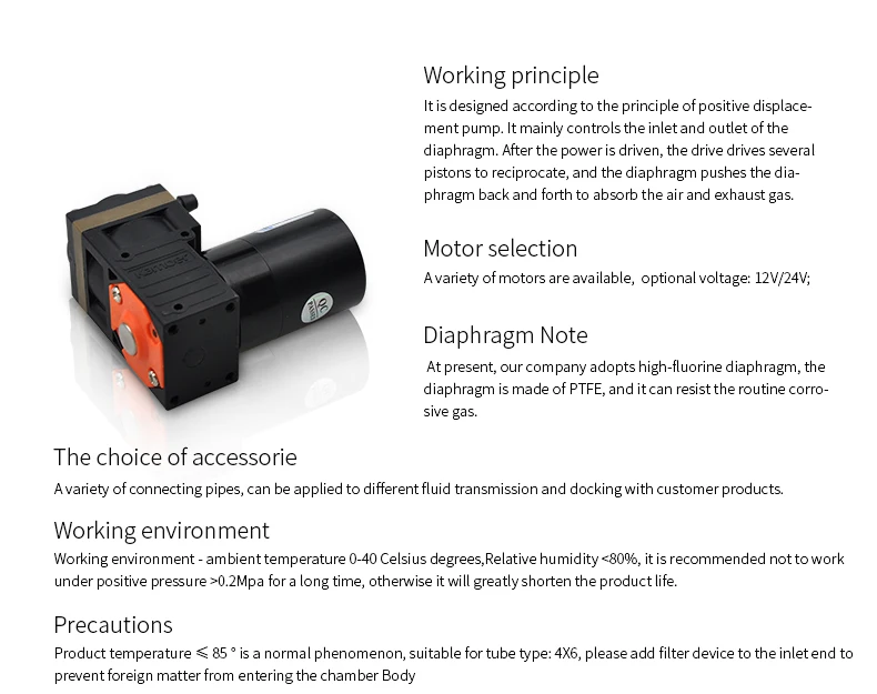 It is designed according to the principle of positive displacement pump. It mainly controls the inlet and outlet of the diaphragm. After the power is driven, the drive drives several pistons to reciprocate, and the diaphragm pushes the diaphragm back and forth to absorb the air and exhaust gas.