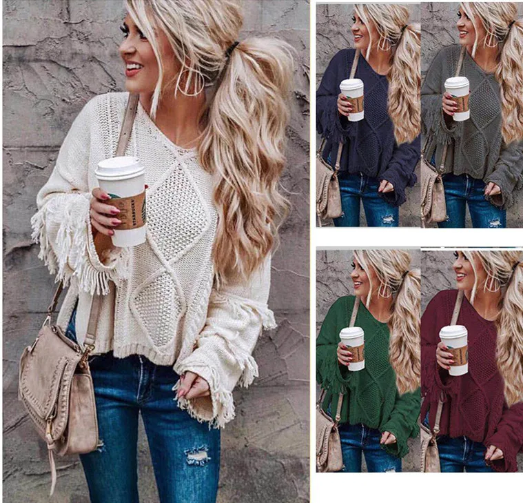 Fashion V Neck Flare Sleeve Women Casual Tassel Sweater