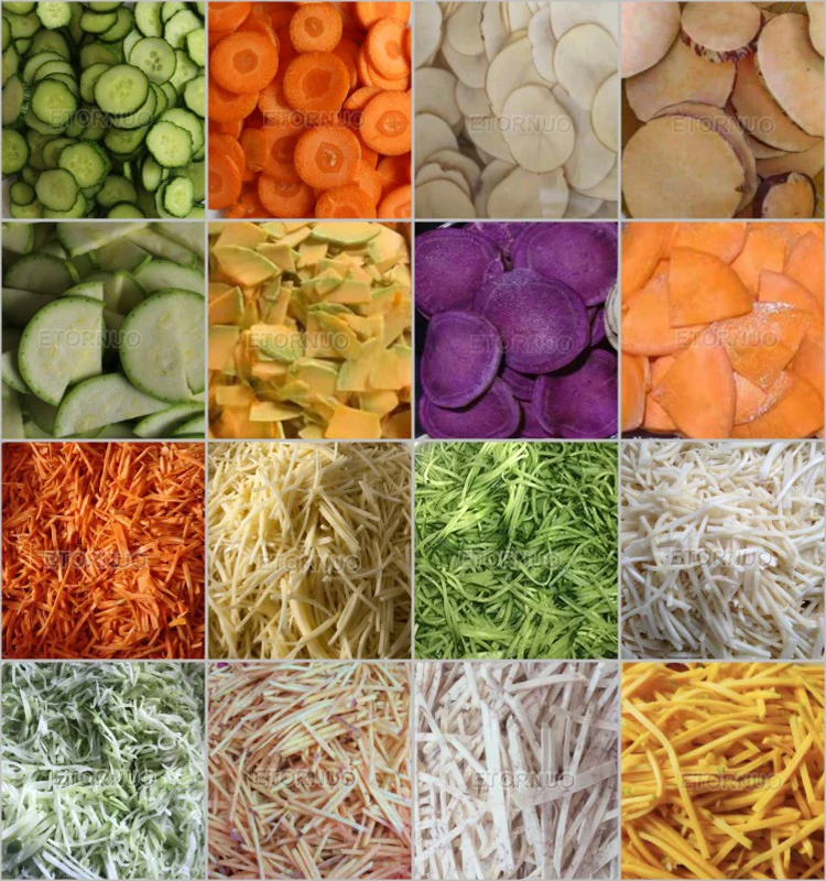 A2:The vegetable cutting machine with price can cut vegetables and fruits like potato, sweet potato, carrot, parsnip, radish, turnip, kohlrabi, beet root, lotus root, onion, cucumber, zucchini, pumpkin, pineapple, papaya, pitaya, apple, pear, lemon, orange, kiwi, carambola, plum, etc. into slices and julienne.