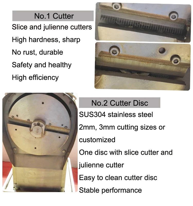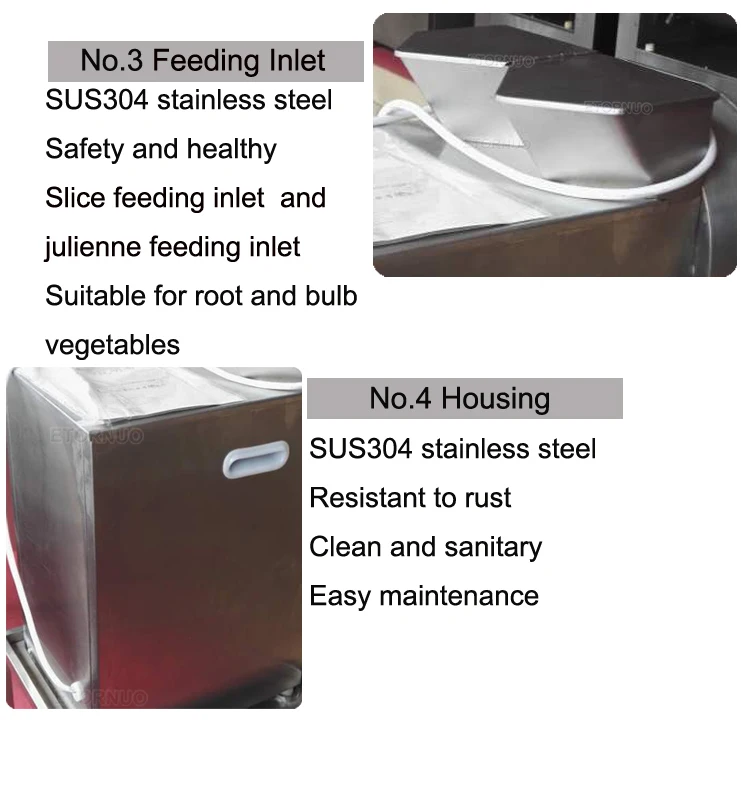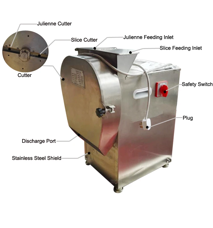 The vegetable cutting machine with price consists of frame, slice and julienne cutters, feeding inlet, discharge port, safety switch, plug, stainless steel shield, etc.