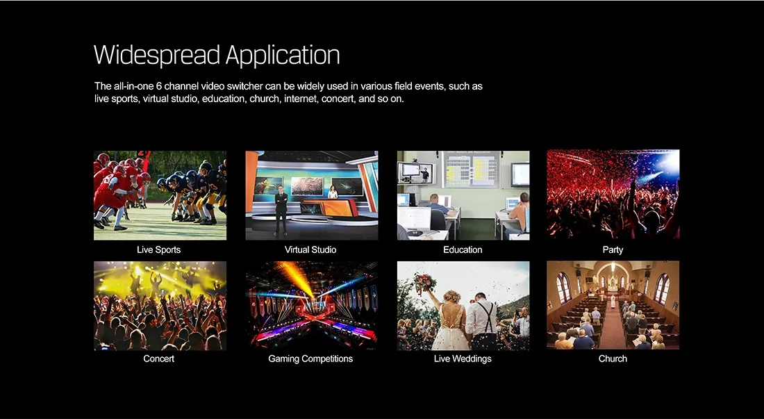* (1) 6 channel inputs: 4×SDI and 2×HDMI inputs (2) 2×SDI &1×HDMI PGM outputs, 1×SDI AUX output, 1×SDI &1×HDMI multiview outputs (3) 6 input signals autuo detected, multi format signals supported (4) T-Bar/ AUTO/ CUT transitions and MIX/ FADE/ WIPE effects