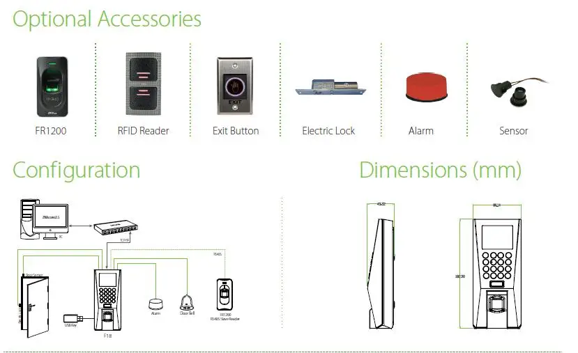 Access Control Interface | 3rd Party Electric Lock, Door Sensor, Exit Button, Alarm, Doorbell | |