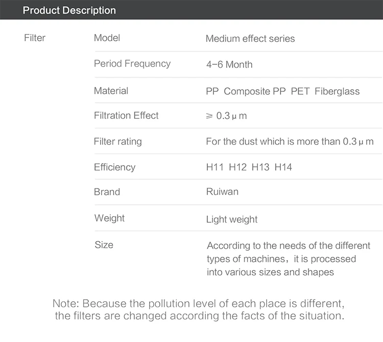 Efficiency | Mainly used to intercept particles under 0.3 μm |