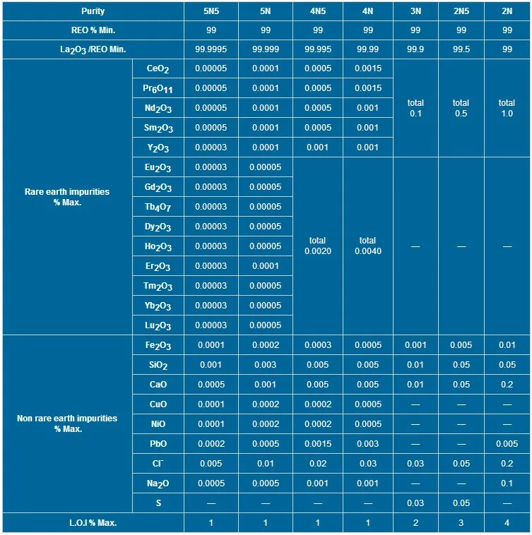 La2O3/TREO | 3N, 3N5, 4N | |