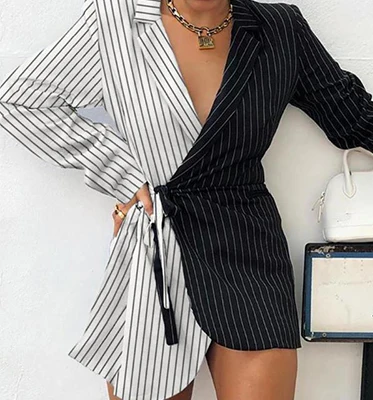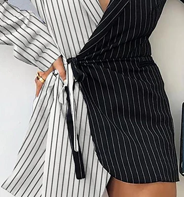 Women's Half Black Half White Striped Colorblock Insert Knotted Wrap Blazer Dress