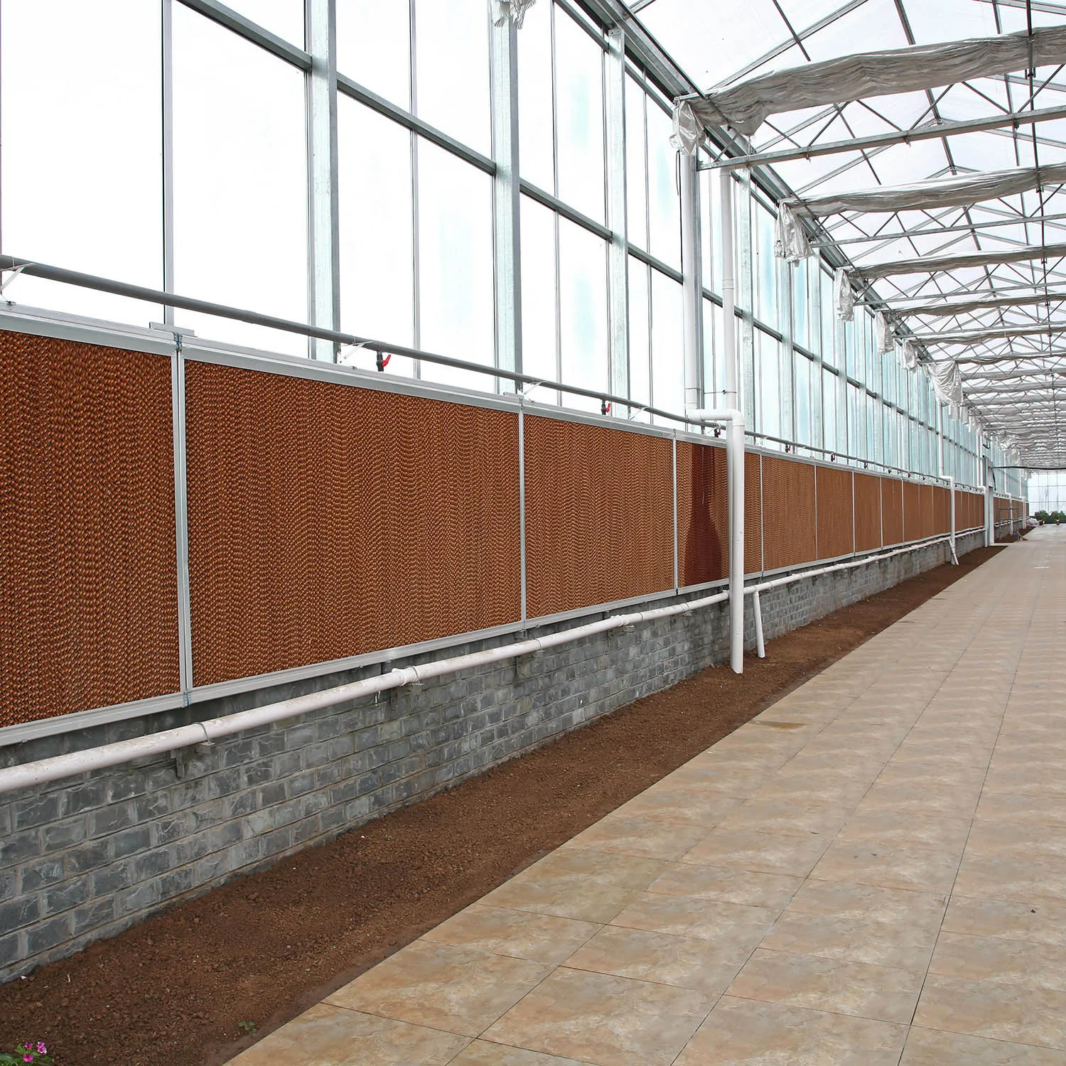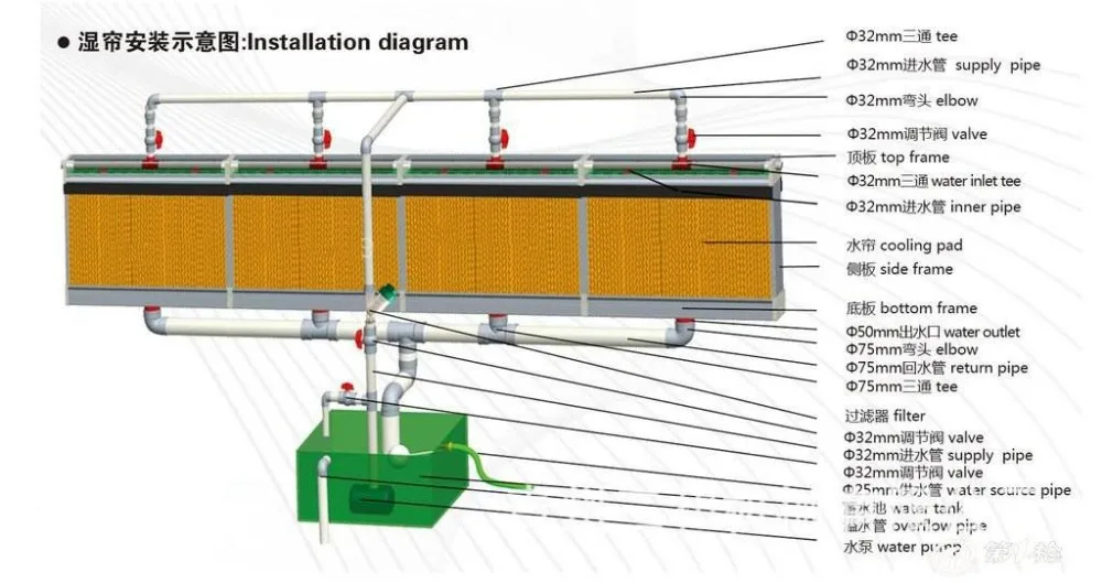 After the exhaust fan starts, the indoor high temperature air is continuously pumped out, making a pressure difference between indoor and outdoor, thus forcing the air outside the wet curtain to cool through the wet curtain and enter the greenhouse, so as to achieve the cooling effect through the continuous circulation and cooling of air.In the case of lower relative humidity and faster evaporation, the cooling effect is more significant.The continuous cooling effect of the system is good, and the cooling effect is obvious near the water curtain.
