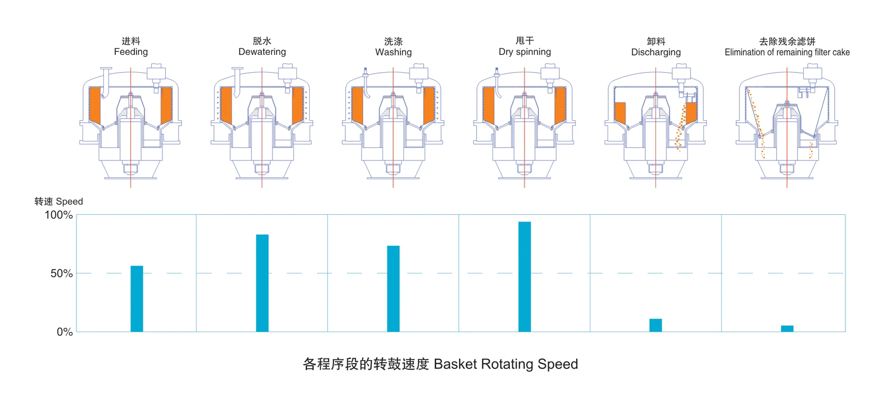 ◇Fully-enclosed discharge hopper design separating the material from the driving components of the centrifuge. | ||||||||