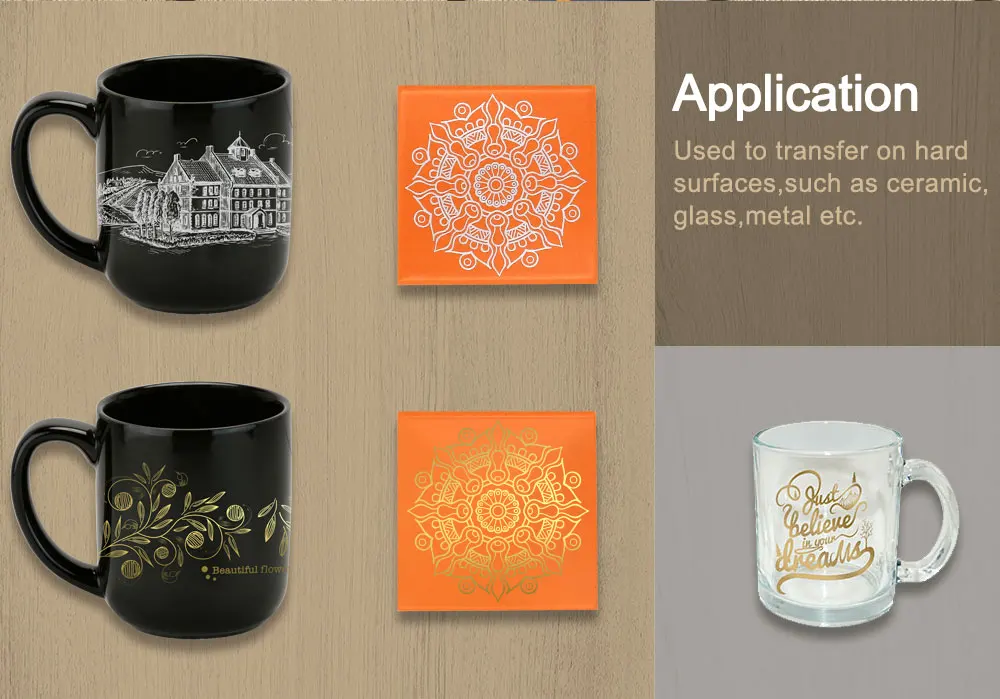 transfer, such as ceramic tile, metal plate, glass, wood board, etc., It also can be used on cups or mug.