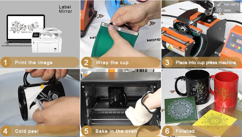 7.For baking temperature and time: the tile, cup and metal 210-220 °C, 5 minutes. 8.For the material which could not endure high temperature, adjust them flexibly in the actual operation. The principle is not to exceed the maximum temperature that the object itself can withstand. Large items that are inconvenient to be placed in the oven can be dried naturally.