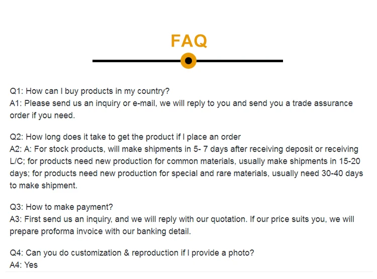 Delivery time | 1.The products in stock will delivery immediately received the payment. 2.According to the order quantity,prompt delivery. | ||