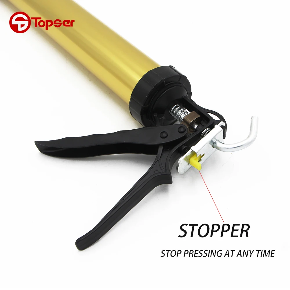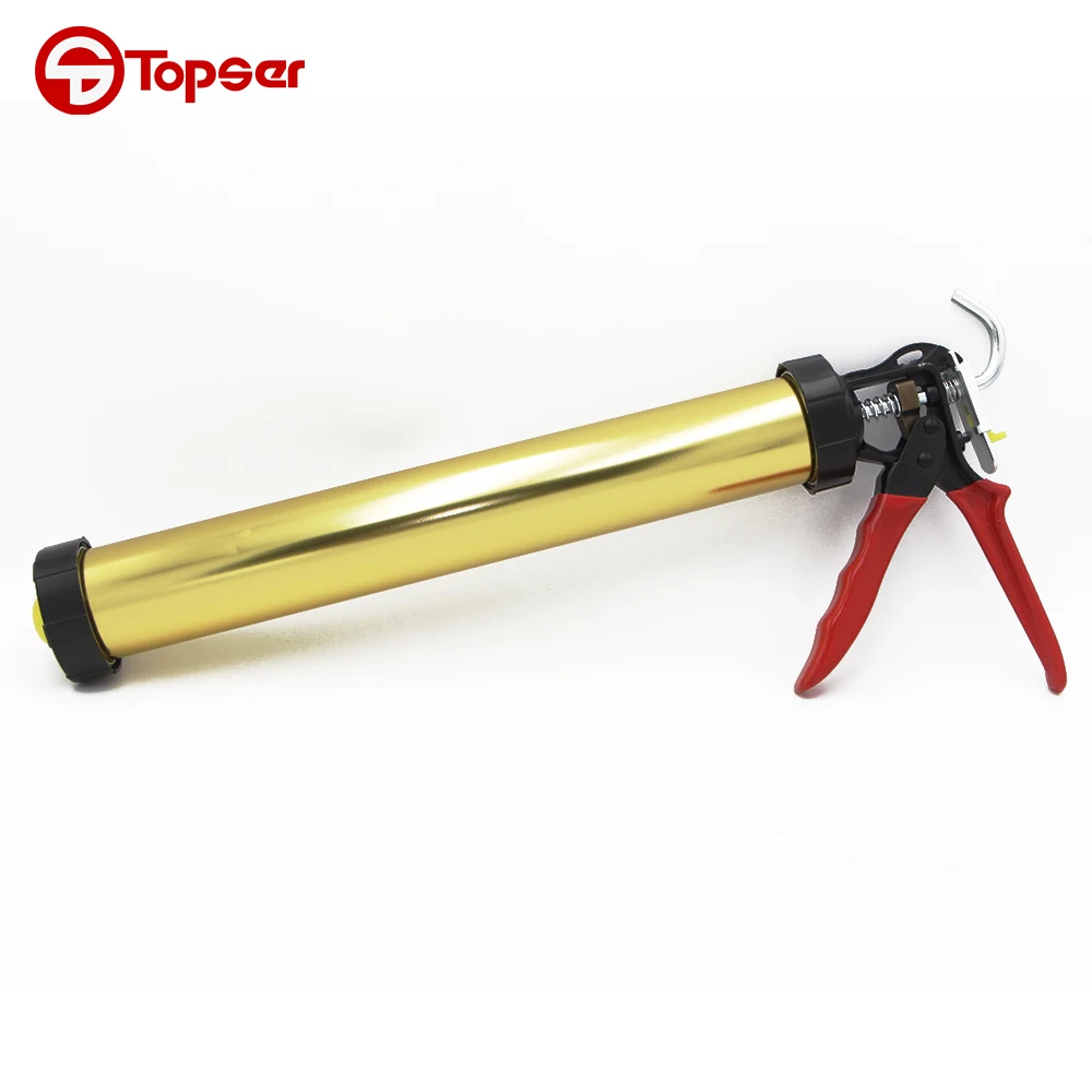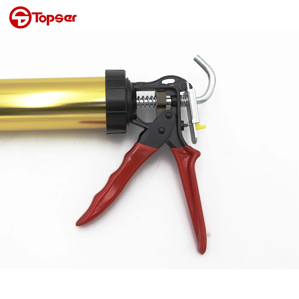 Caulking gun,also called soft plastic caulk or Sausage Pack Caulk guns, is an adhesive caulk seal glue tool.Using the leverage,if it is used with plastic buckets or glue stick, the soft-mounted rubber/sausage/glass in the gule bucket or gule stick will be easily pressed from the plastic beak.And the products are dispensed from the pipe or tube,such as caulks,sealants and adhesives, which can save operating time.It is widely used in building decoration.window cracks,advertising characters fixation and glass suture.