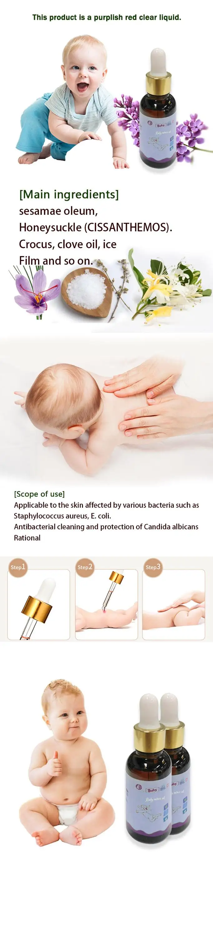 [Main ingredients] sesamae oleum,Honeysuckle(CISSANTHEMOS).Crocus, clove oil, ice Film and so on. This product is a purplish red clear liquid. [use] Applicable to the skin affected by various bacteria such as Staphylococcus aureus, E. coli. Antibacterial cleaning and protection of Candida albicans Rational
