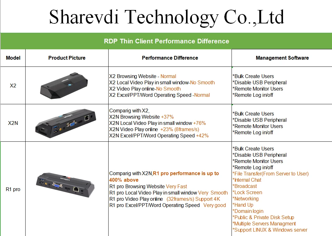 Sharevdi Technology Co., Ltd is a professional zero client, MINI PC and all-in-one solutions provider which is committed to R&D, manufacture and marketing of this field. R&D team is located in Wuhan Hubei province. Both factory and marketing are in Shenzhen. We get involving these field since 2006 which make us gain more experience than other competitors. We aim to help customers saving cost and enhancing data security by applying different solutions. With our own R&D team and factory, which make us can offer OEM service for hardware and software to meet different customers's requirements.