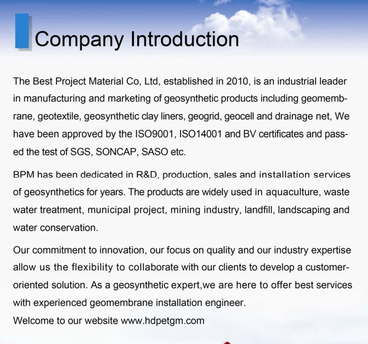 Welding machine is available for your installation.If necessary,our welder can fly to your project site and install the pond liner.About the project design,we can also give you our rough advice.