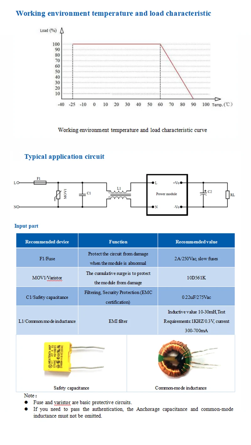 4.1 Products designed to meet UL, CE safety certification requirements. 4.2 Safety and electromagnetic compatibility Designed with the input of 0.5A UL certified insurance; PCB board using double-sided copper clad plate production, material for the 94-V0 fire rating level; Safety standards: Compliance with UL1012, EN60950, UL60950 Insulation voltage: I / P-O / P: 2500VAC Insulation resistance :I / PO / P> 100M Ohms / 500VDC 25 ℃ 70% RH Conduction and radiation :comply with EN55011, EN55022 (CISPR22) Electrostatic discharge :IEC / EN 61000-4-2 level 4 8kV / 15kV RF radiation Immunity: IEC / EN 61000-4-3 See Application Note 4.3 Temperature safety design At room temperature,the capacitors of this power , the inner surface of the main converter maximum temperature does not exceed 90 ℃; Shell maximum surface temperature does not exceed 60 ℃