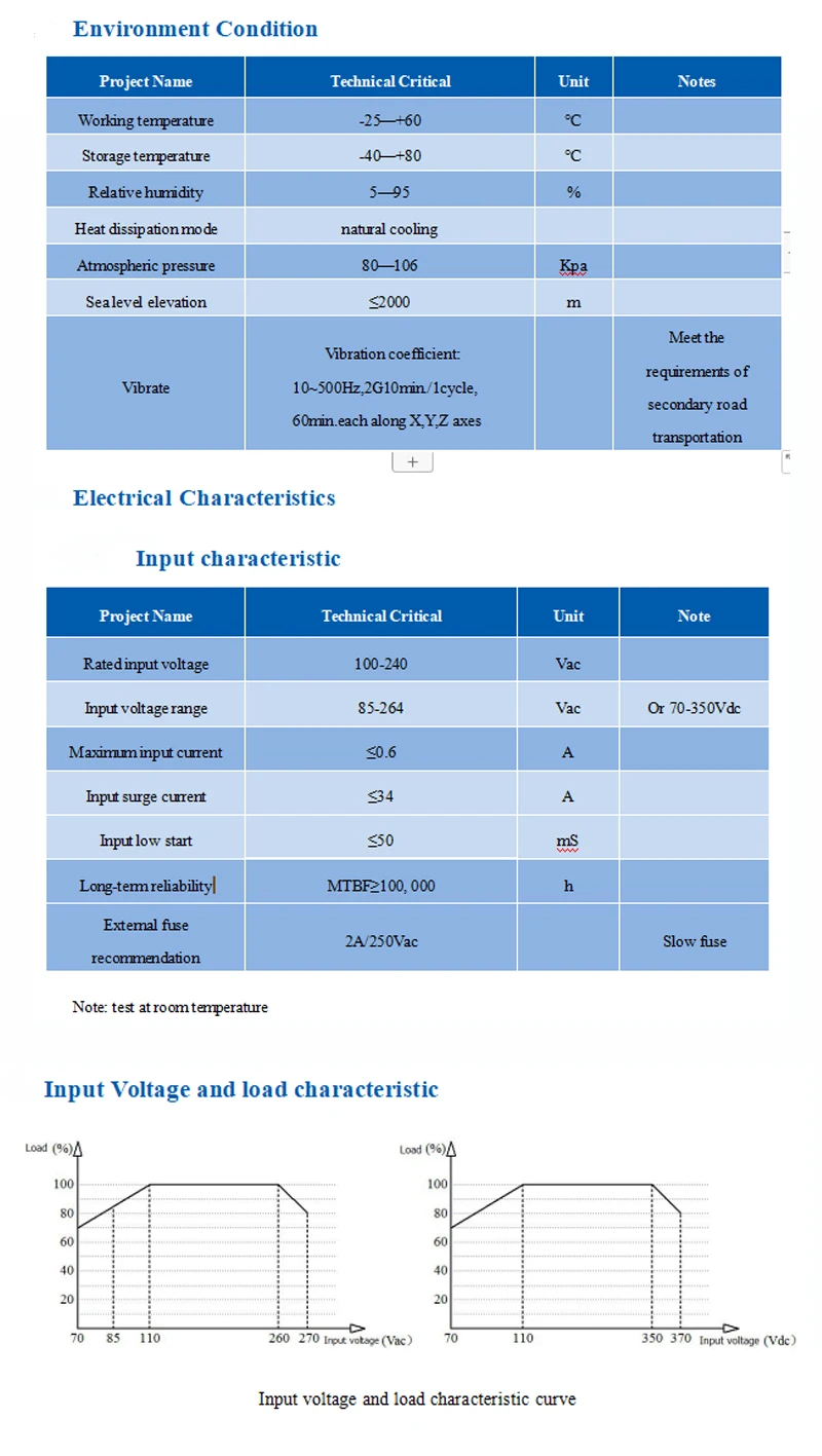Item Name Technical Criteria Unit Rated input voltage 100-240 VAc Input voltage range 90-264 VAc Maximum input current ≤0.2 A Input current surge ; ≤10 A maximum input voltage ≤270 VAc Enter slow start ≤50 mS Input Low Voltage Efficiency Vin=110VAc,Output full-load≥69 % Input High Voltage Efficiency Vin=220VAc,output full-load≥70 % Long-term reliability MTBF≥100,000 h Load rated output voltage +5±0.1 VDc Full rated output voltage +5±0.2 VDc Short-term maximum output current ≥1000 mA The maximum output current for a long time ≥600 mA Voltage Regulation ±0.2 % Load Regulation ±0.5 % Output ripple and noise (mVp-p) ≤50 Rated input voltage, full load. Using 20MHz of bandwidth, The load side 10uF and 0.1uF capacitor to be tested. mV Switch overshoot amplitude (Rated input voltage and output load plus 10%)≤5 %VO Output over-current protection 150-200% of the output maximum load A Output short circuit protection Direct short circuit at the normal output, automatically resume normal operation after a short circuit removal