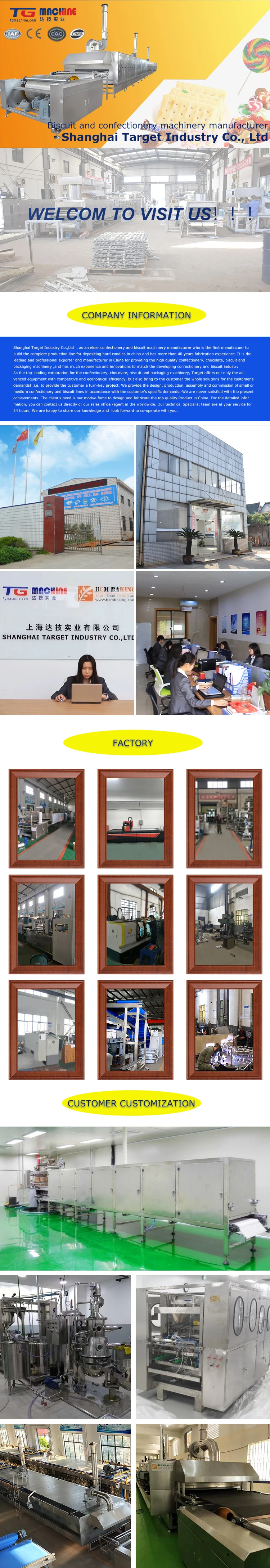 Shanghai Target Industry Co.,Ltd as an elder confectionery and biscuit machinery manufacturer who is the first manufactuer to build the complete production line for depositing hard candies in china and has more than 40 years fabrication experience. It is the leading and professional exporter and manufacturer in China for providing the high quality confectionery, chocolate, biscuit and packaging machinery ,and has much experience and innovations to match the developing confectionery and biscuit industry!As the top-leading corporation for the confectionery, chocolate, biscuit and packaging machinery, SHINWEI offers not only the advanced equipment with competitive and economical efficiency, but bring to the customer the whole solutions for the customer's demands! ,i.e. to provide the customer a turn-key project. We provide the design, production, assembly and commission of small or medium confectionery and biscuit lines in accordance with the customer's specific demands.We are never satisfied with the present achievements. The client's need is our motive force to design and fabricate the top quality product in China. For the detailed information, you can contact us directly or our sales office /agent in the worldwide. Our technical specialist team are at your service for 24 hours. We are happy to share our knowledge and look forward to co-operate with you.
