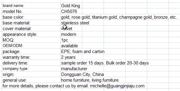 Our main product are modern stainless steel living room & dining room furniture, including TV stand,coffee table, dining table, console table, armchair,and so on. Our brand is Gold King.