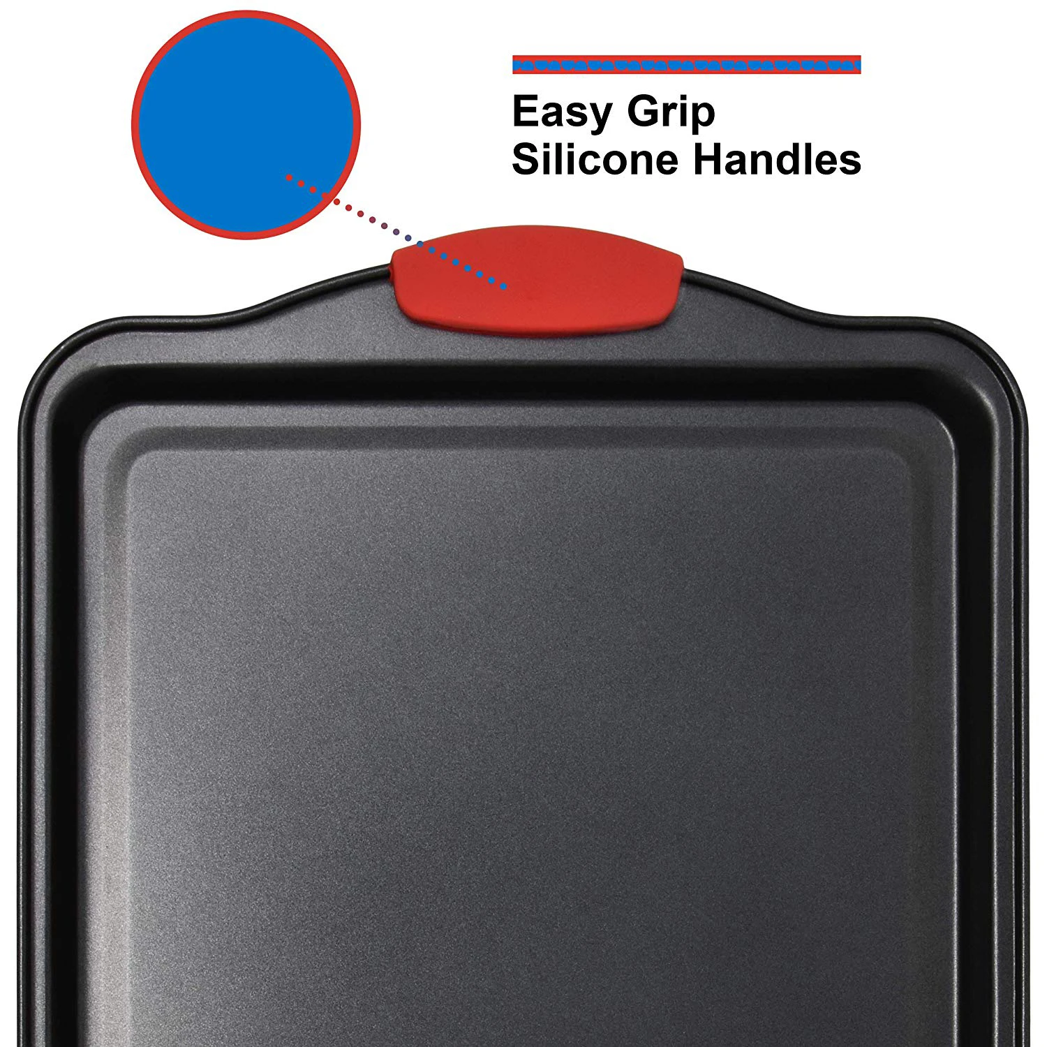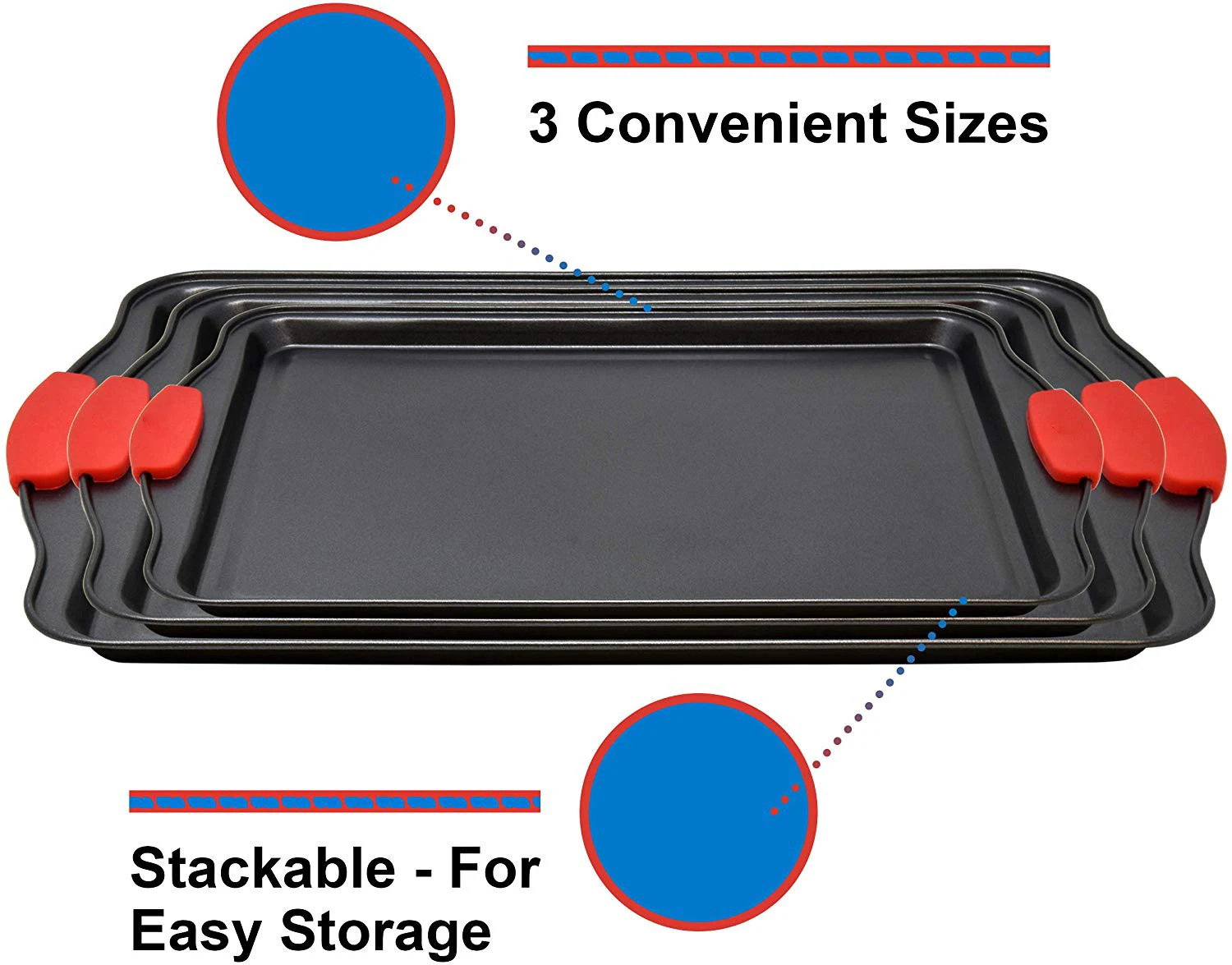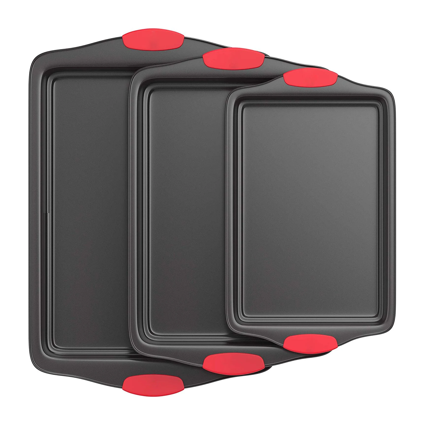 NON-STICK for SCRATCH FREE RESULTS - These professional quality bakeware sheet pans feature a food grade nonstick coating inside and out. The coating keeps the pans scratch and rust resistant, which also makes cleaning and food release easy as pie CONSISTENT HEAT DISTRIBUTION - These lightweight cookie trays are built with tough, heavy duty carbon steel to evenly disperse weight and heat for perfectly baked treats! Suitable for use in all oven types with temperatures up to 450°F (No broiler) WIDE HANDLES with SILICONE GRIPS - Each fully rimmed pan has wide handles with removable, BPA free and heat safe silicone grips for extra robust and nonslip handling. All are great to use as a baked macaroon, cake, cupcake or jelly roll serving tray STACKABLE for EASY KITCHEN STORAGE - This multi-sized metal baking sheet set neatly nests together for easy storing in the cupboard, drawer or countertop rack. To clean these baking tools, hand wash only with soap and dry thoroughly to prevent rust