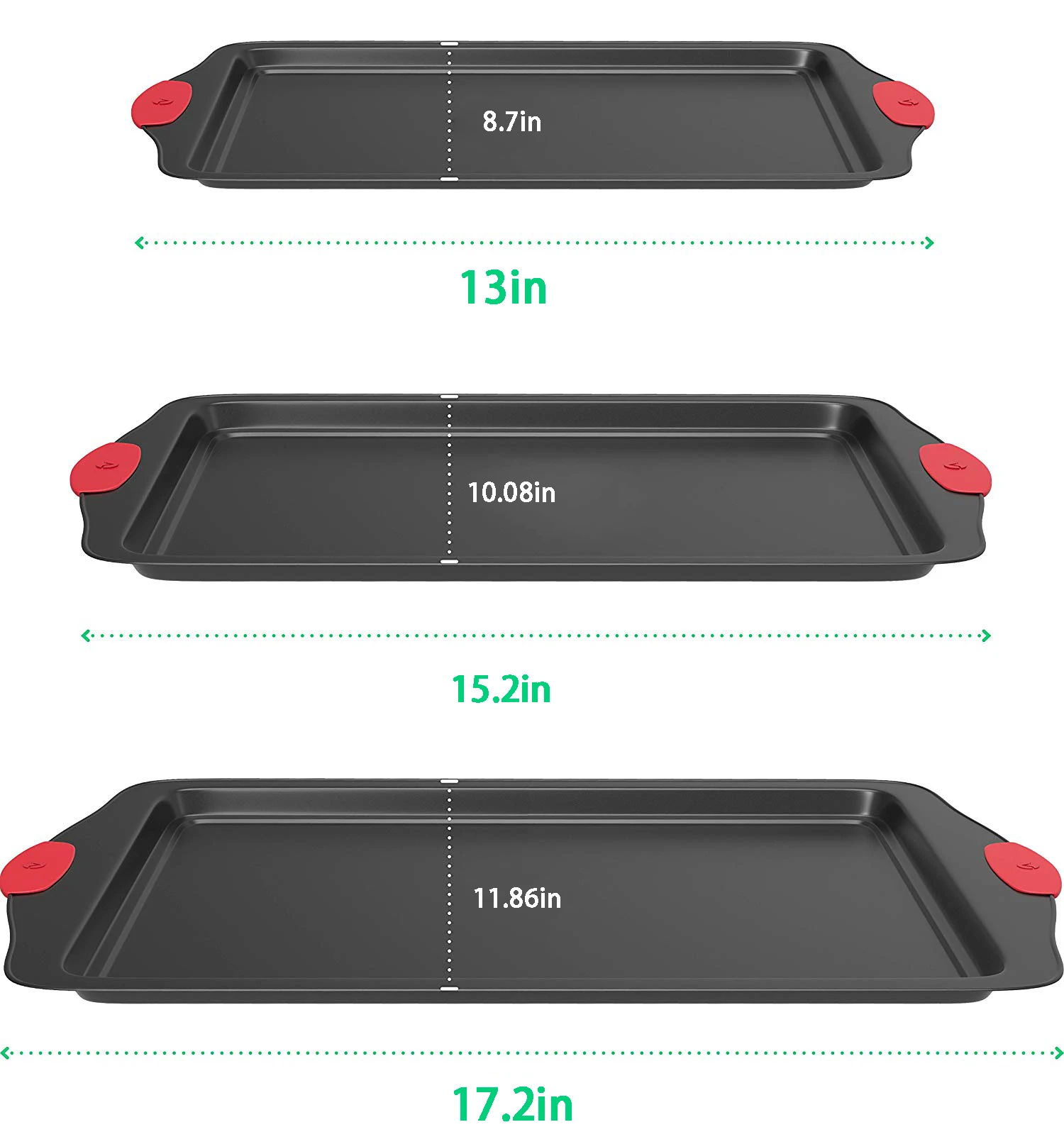 SET of THREE MULTI SIZED BAKING SHEETS - Make bulk batches of oven-baked goodies with this non stick cookie tray set. Includes 1 large half sheet pan (17 x 11.5 inches), 1 medium sheet pan (15 x 11.5 inches) and 1 quarter sheet pan (13.5 x 9 inches)