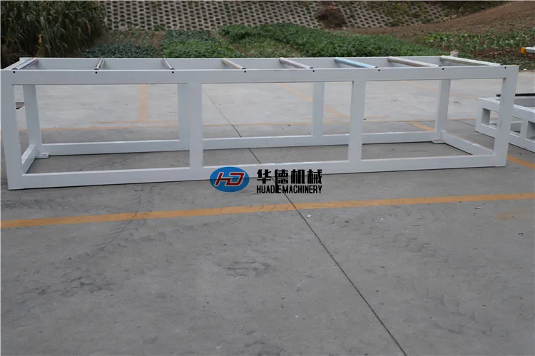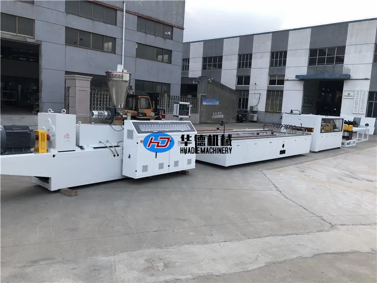 This line applies the conical twin screw extruder with imported inverter, which provides wide adjusting range and precise temperature control. The downstream equipment includes calibration table, hauler, cutter and stacker. The calibration table is equipped with strong forced cooling system so that it can provide perfect calibrating effect. The caterpillar hauler is equipped with precision gear motor and inverter, which possesses reasonable structure, strong and stable hauling force. The cutter is equipped with PLC control system which helps to set length and provide accurate automatic cutting. The stacker is covered with rubber grip blocks to prevent products from damage.