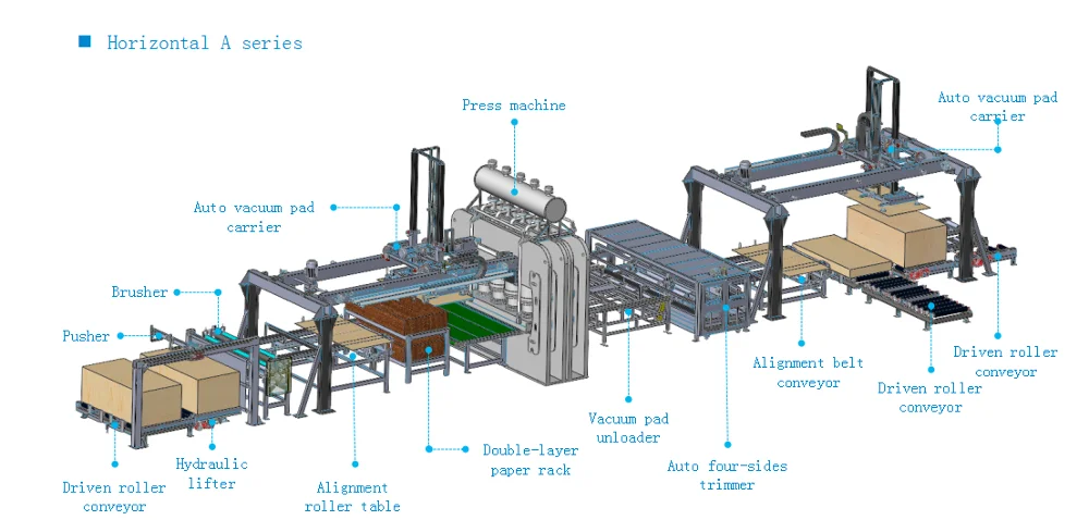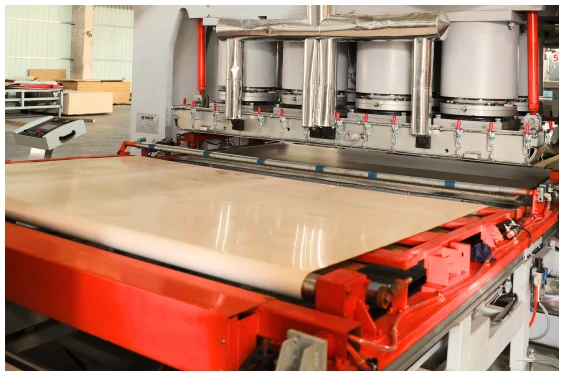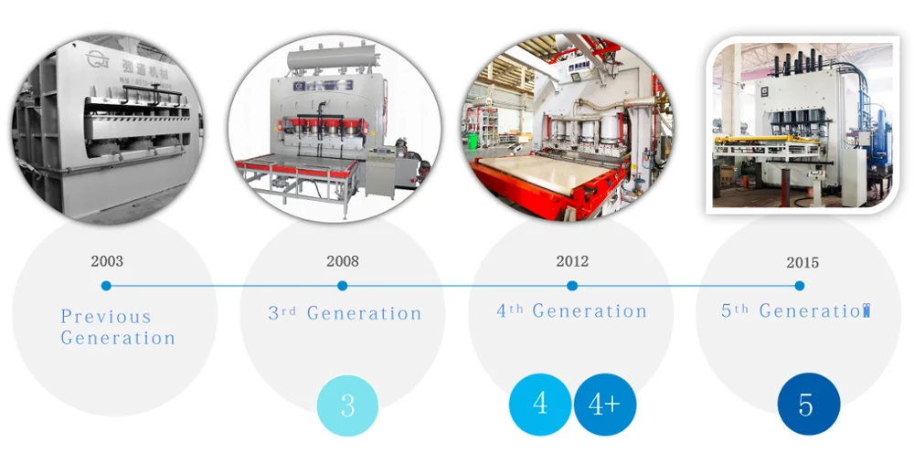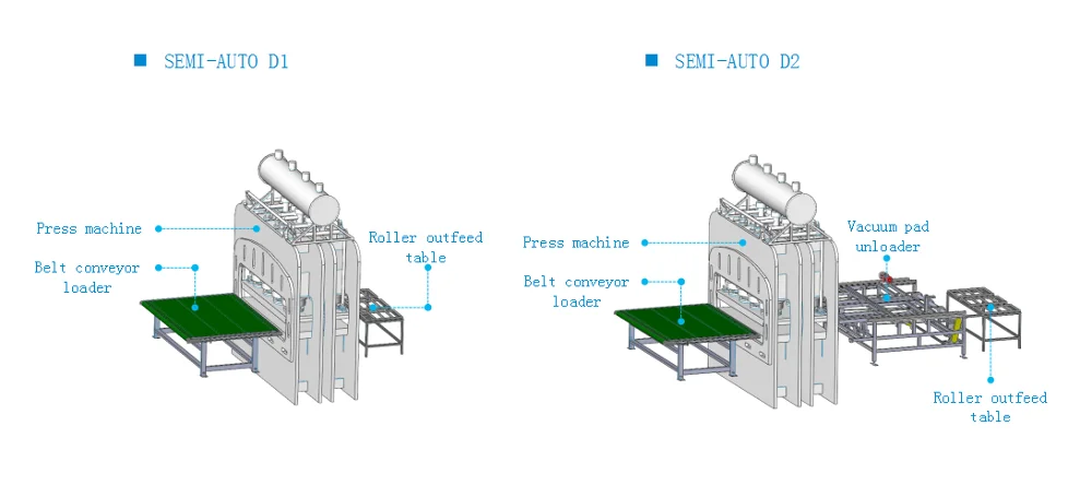 The short cycle press line is for laminating melamine paper / phenolic film / veneer on particle board / MDF / HDF / plywood. The laminates could have all kinds of surface texture such as glossy, mirror, matt, suede, snow, woodgrain, and EIR board.