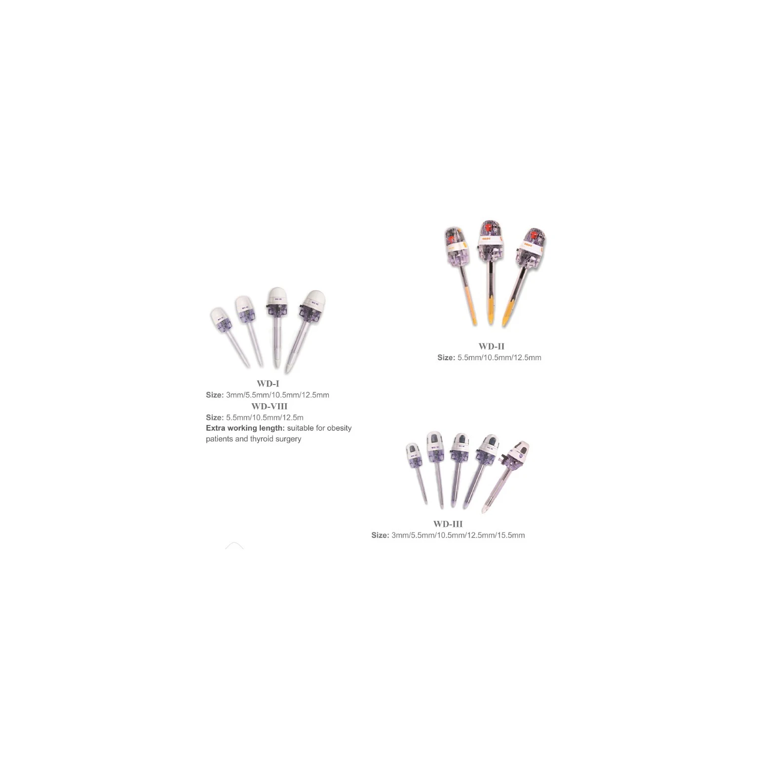 Below is our specification sheet for all trocar single pack, we also have trocar kit. Please contact me if you need.