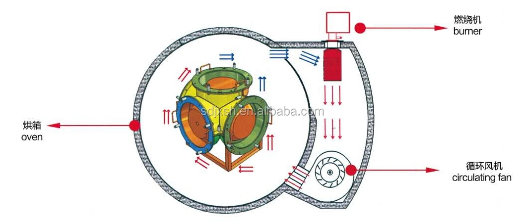 It consists of an oven, a cooling chamber, and mould spindles. The spindles are mounted on a rotating axis, which provides a uniform coating of the plastic inside each mould.