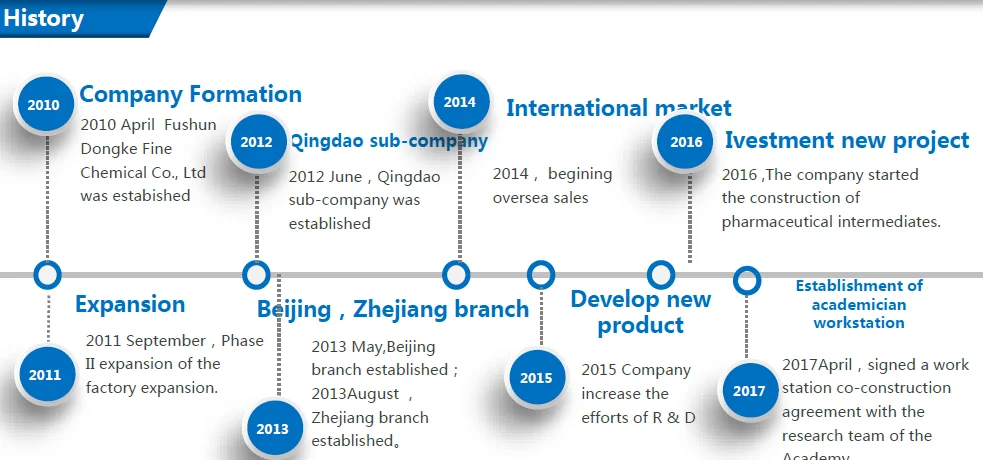 Fushun DongkeFine Chemical Co., Ltd. was founded in 2010,we are a manufacturer of polyunsaturateether monomer series, concrete admixtures series, lithium battery electrolyte solvent series, pharmaceutical intermediates series , paraffin wax series etc. After years of steady development, the company successively established sub-company in Beijing, Zhejiangand Shandong province.
