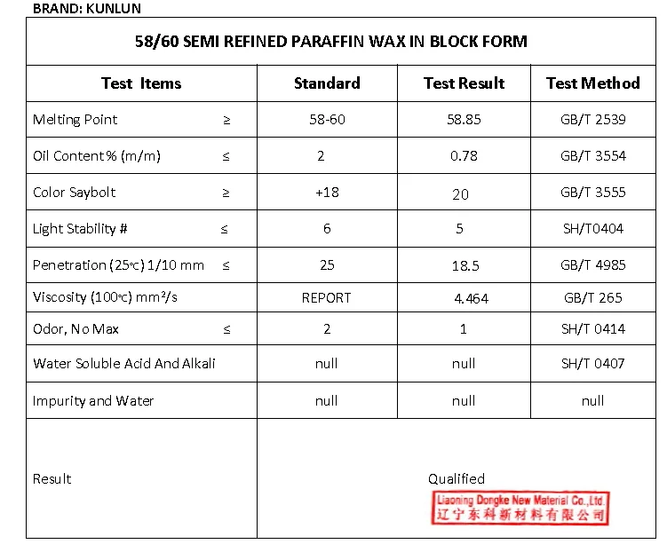 58/60 | Daqing Kunlun Semi Refined Paraffin wax |